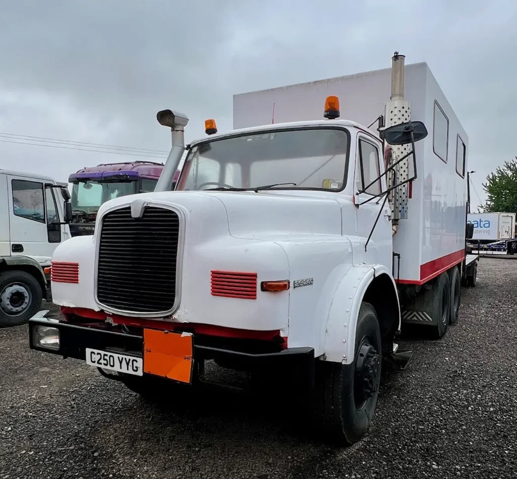 RIGHT HAND DRIVE, BOX BODY WITH WINDOWS, FIRST REGISTERD 1985, 6 cylinder 11.5 LITRE DIESEL ENGINE, 25500 KG REVENUIE WEIGHT, FITTED WITH 3 X HYDRAYLIC LIFTING RAMS TO JACK THE TRUCK OFF THE GROUND,